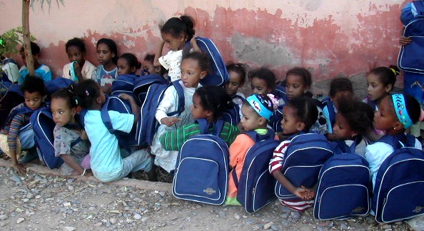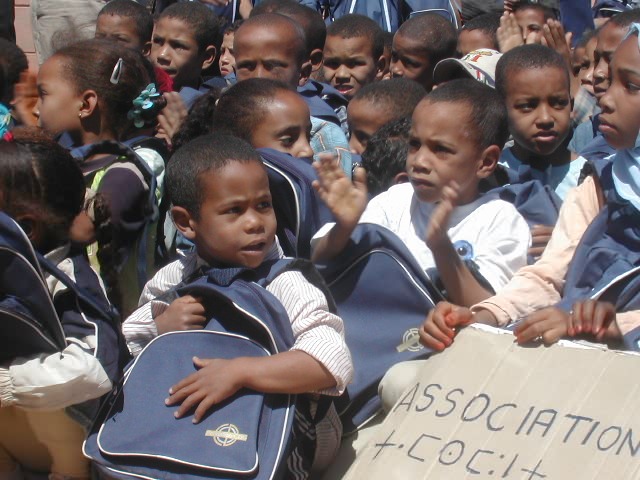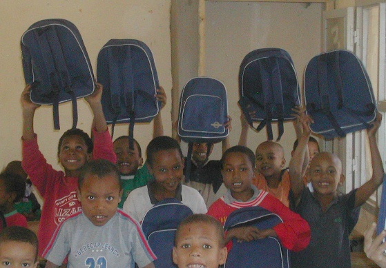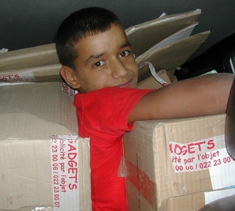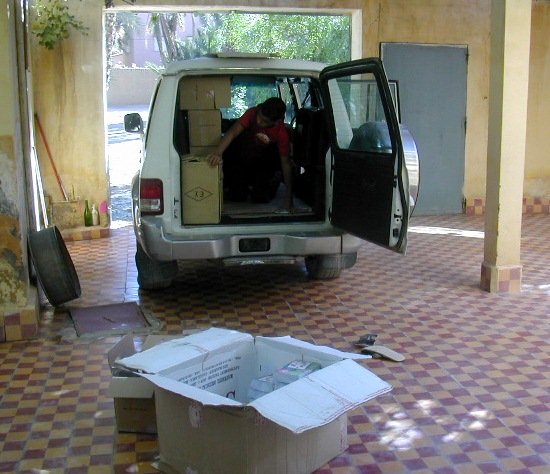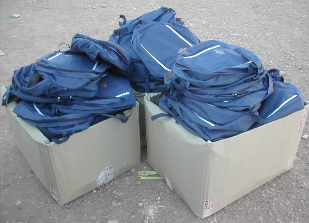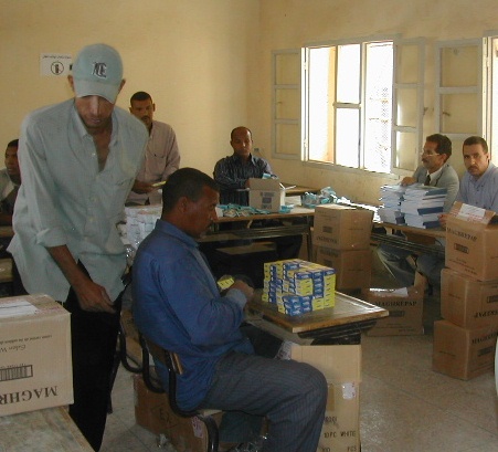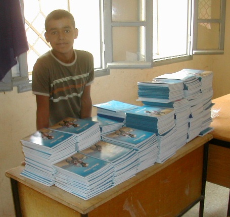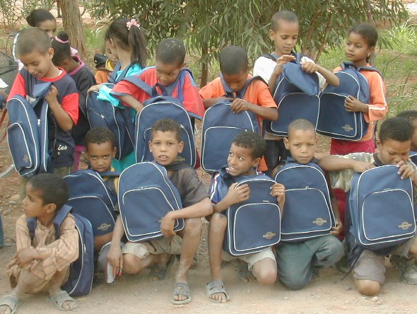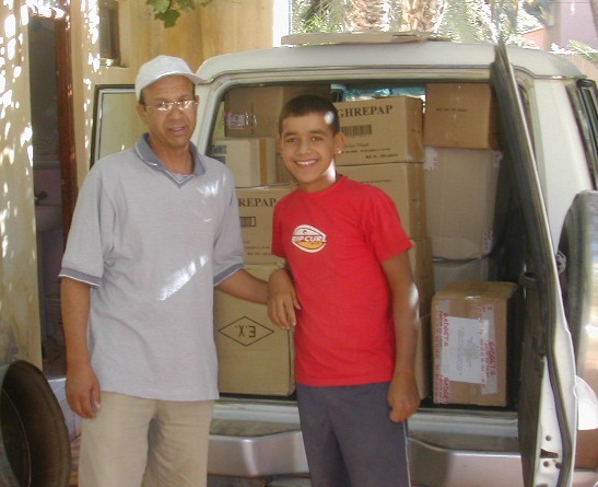 | Cartables, cahiers, fournitures (trousse, stylos, crayons, ardoise, règle, etc), soit 3 m3 de cartons, entreposés chez le Trésorier, Lahcen Guerdou. |