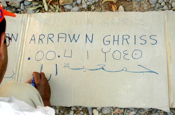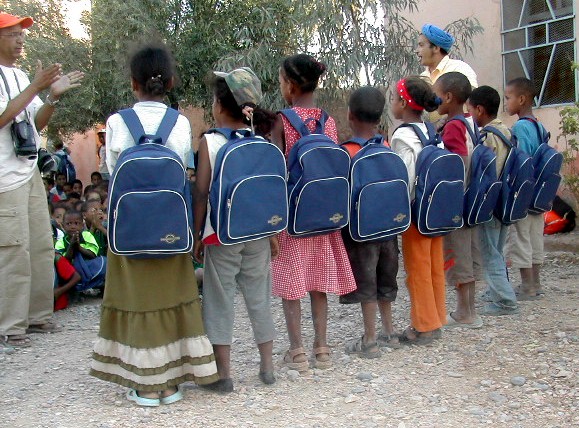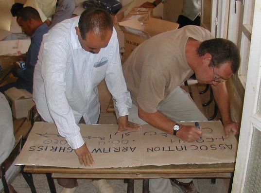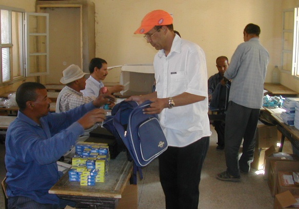 | Moha Allali indique aux bénévoles les fournitures à distribuer à chaque enfant. |